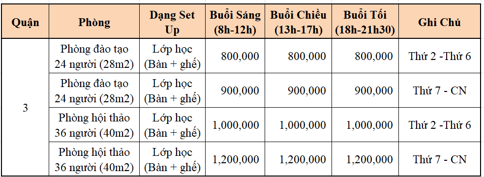 Phòng học và Phòng hội thảo tại Quận 3, 5 và Quận 10 được cung cấp cho thuê phòng từ 8h đến 21h30 mỗi ngày có sức chứa từ 10 người đến 100 người. Để biết thêm chi tiết vui lòng liên hệ 0908645117