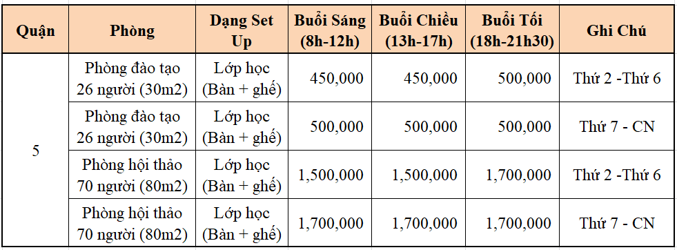 BẢNG GIÁ DỊCH VỤ CHO THUÊ PHÒNG HỌC- HỘI THẢO TẠI TPHCM